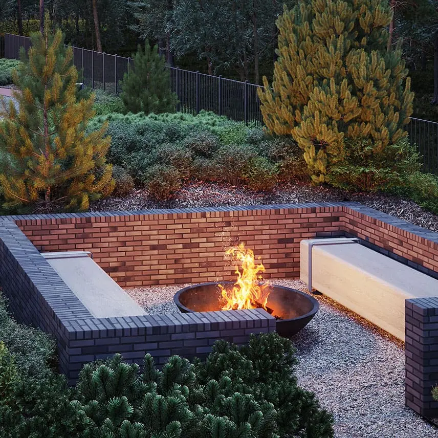 Оборудованы 2 площадки для встреч у костра, обогреваемая фуршетная зона, подиум с деревянными шезлонгами и декоративный водоем с кинетической скульптурой.