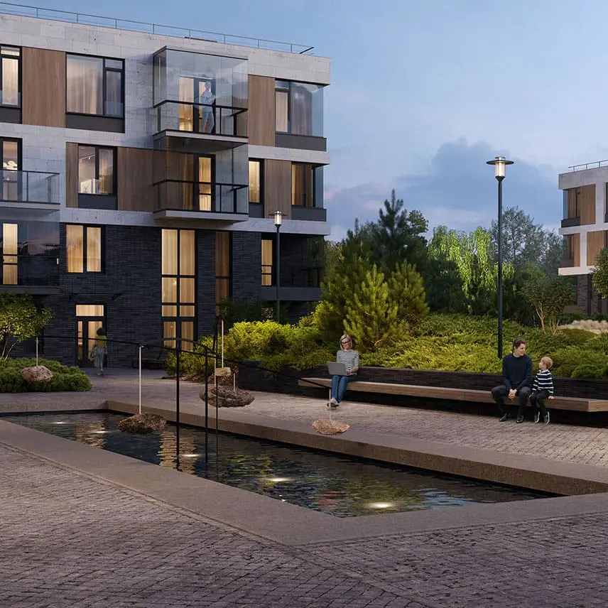 Архитектура в скандинавском стиле, открытые беседки у костра, 200 м от Финского залива. Квартиры с террасами и палисадниками, а в двухэтажных высота потолков до 6 м.